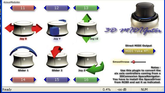 How to use a 3DConnexion SpaceNavigator as a midi controller using RBC9's custom driver & acousmodule's 3D Midigator VST UPDATE 8-29-09 The webpage for Don Muddiman's "HONS system" (Hands On Navigator and Stick) provided a new download for RBC9's updated driver with the "LED off" option, binds, plus the source code and documentation, which I've re-uploaded here but click this link to see his HONS "6D" DIY controller (pictured here). Step 1) exit the 3DxWare application (the software that comes with your 3DConnexion product) If, like me, you're going to be using the SpaceNavigator only as a midi controller in your music applications it may be worthwhile to stop the application from automatically running when your system starts. The application does not interfere with RBC9's driver except when you're installing it but if it's not needed there's no reason to let it load every time. I used sysinternals "autoruns" program to do this. Just unclick the box next to "Start 3DxWare.lnk" in the "Logon" tab Step 2) click this link to download RBC9's driver, binds, doc and source You'll likely have to wait 30 seconds for the download link to appear on that rapidshare page Step 3) unpack the .rar using WinRAR or 7Zip (freeware) Step 4) click on the "setup" to install the program and just follow the instructions Step 5) Click Start Menu, then Control Panel, then System, then click the Hardware tab at the top, then click on the Device Manager Step 6) Click on the "Human Interface Devices" then right click on the bottom one and select Properties. If it says it's a SpaceNavigator, then you've got the right HID. Step 7) Right-click on that HID again and select "Update Driver" Step 8) Choose the options "no, not this time" then "install from a list of specific location" then "Don't search. I will choose the driver to install" then select RBC9 SpaceNagivator MouJoyKey and then click "next." When it tells you the driver isn't signed click "install anyways" and let the driver installation complete (the previous installation above put the .inf and .sys files in your Windows directory and the driver install will find them on it's own) Step 9) Now you can start the "RBC9-SpaceNav" application. The easiest shortcut to this is Start Menu and then it'll be at the very top by Windows Update. Step 10) download the 3DMidigator VST from AcousModules: and unpack the VST .dll into whatever your default VST folder is there's also a standalone version on that page and I recommend using it to configure your RCB9 SpaceNav "layout" Step 11) start the standalone 3DMidigator or your DAW and the VST version so that you can see whether playing with the SpaceNavigator is making the little numbers move Step 12) look at the GUI of the 3DMidigator. Below each icon of the axes is text which shows what bindings you should use on the layout you're to use with 3DMidigator. Then look at your TaskBar where there'll be a little joystick-like icon with a 3-color circle spinning around it. Right-click that to get RBC9's SpaceNav application's contextual menu. Select "Edit Layout" Step 13) On the bottom left of the Layout Editor screen under "Layout" right click and select "add" - you can click the name of the layout and edit it to be called whatever you'd like. I named mine 3DMidigator VST. Step 14) On the upper right part of the Layout Editor screen click the icon of the axis of movement you'd like to "bind" to a certain action. When each is selected new menus appear directly below. For this particular application you're going to want to select "Joy-Axe" under the "Bind Type" menu then whichever is indicated on the 3DMidigator's GUI, generally under "Seclect Joystick Axe" choose X, Y or Z or "slider" or what have you. My editor didn't exactly match the GUI's choices but works with what I selected... for instance I don't see a way of indictating "slider 1" or "slider 2" just "slider... Step 15) When you're done editing your layout, right click on the name of this layout under the "Layout" list on the bottom left again and select "Export Binds" so that you can recover it again in the future, and now it''l be stored in the contextual menu for "Switch Layout" in the TaskBar. Step 16) Hit "Apply" in the RCB9 SpaceNav's Layout Editor and hit "yes" when the pop-up asks you if you really want to aplly the layout. Step 17) Switch back to 3DMidigator. The little numbers should now move when you twiddle your SpaceNavigator. Click beneath the "Direct Midi Output" to select where the plug-in's midi out is routed to, and click on the colored fields with numbers in the to select what Midi CC# is being sent from that particular axis of the SpaceNavigator's controller movement. Additional links: RBC9's original driver post on the 3DConnexion user forum Please feel free to contact me with any further tips, insights or corrections. RBC9_-_SpaceNav driver download that I used I mirrored here on my site, as the original link is long-dead and the 3DMidigator VST layout I created - simply place the file in your C:\Program Files\RBC9\RBC9 - SpaceNavigator folder then right-click in the RBC9-SpaceNav Layout Editor's "Layout" area and select "Import Binds" and click on the file. MS Word format download of this tutorial Thanks so much to RBC9! It's an amazing and empowering app you've made! |